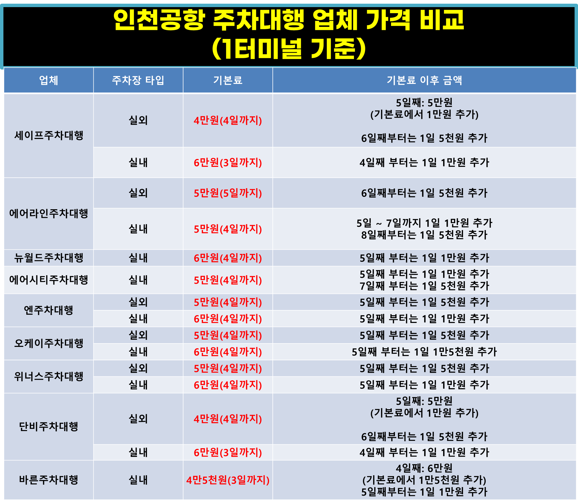 인천공항 주차대행 업체 가격 비교 차트를 보시고
